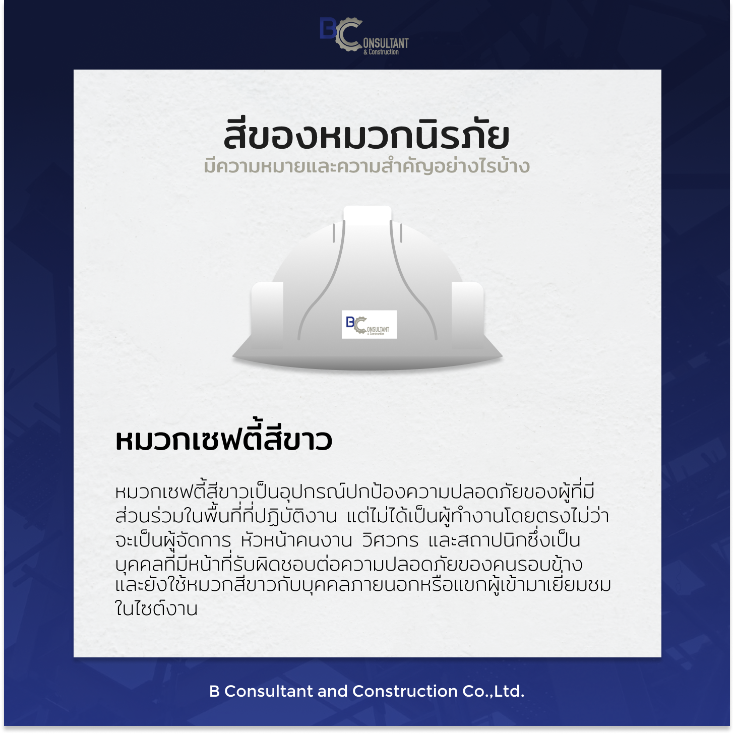 หมวกเซฟตี้สีขาว เป็นอุปกรณ์ปกป้องความปลอดภัยของผู้ที่มีส่วนร่วมในพื้นที่ที่ปฏิบัติงาน แต่ไม่ได้เป็นผู้ทำงานโดยตรง ไม่ว่าจะเป็นผู้จัดการ หัวหน้าคนงาน วิศวกร และสถาปนิก ซึ่งเป็นบุคคลที่มีหน้าที่รับผิดชอบต่อความปลอดภัยของคนรอบข้าง และยังใช้หมวกสีขาวกับบุคคลภายนอก หรือแขกผู้เข้ามาเยี่ยมชมในไซต์งาน