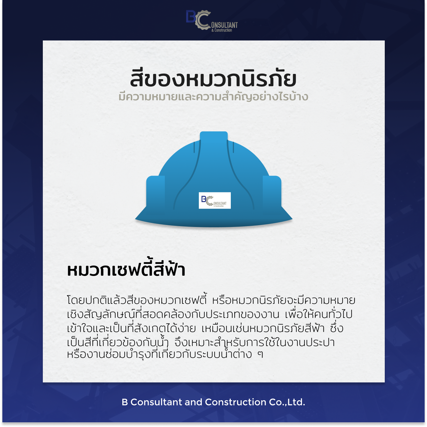 โดยปกติแล้ว สีของหมวกเซฟตี้ หรือหมวกนิรภัยจะมีความหมายเชิงสัญลักษณ์ที่สอดคล้องกับประเภทของงาน เพื่อให้คนทั่วไปเข้าใจและเป็นที่สังเกตได้ง่าย เหมือนเช่นหมวกนิรภัยสีฟ้า ซึ่งเป็นสีที่เกี่ยวข้องกับน้ำ จึงเหมาะสำหรับการใช้ในงานประปาหรืองานซ่อมบำรุงที่เกี่ยวกับระบบน้ำ
