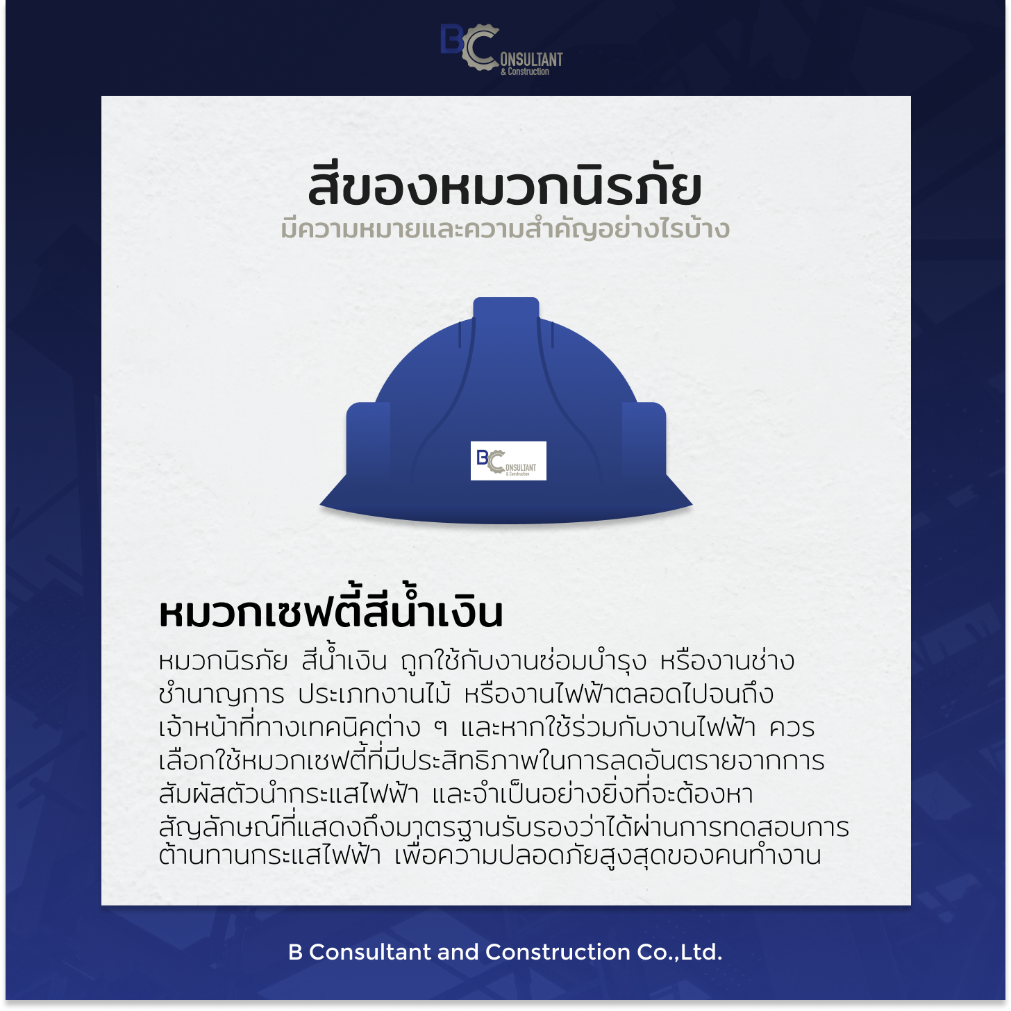 หมวกนิรภัย สีน้ำเงิน ถูกใช้กับงานซ่อมบำรุง หรืองานช่างชำนาญการ ประเภทงานไม้ หรืองานไฟฟ้า ตลอดไปจนถึงเจ้าหน้าที่ทางเทคนิคต่าง ๆ และหากใช้ร่วมกับงานไฟฟ้า ควรเลือกใช้หมวกเซฟตี้ที่มีประสิทธิภาพในการลดอันตรายจากการสัมผัสตัวนำกระแสไฟฟ้า และจำเป็นอย่างยิ่งที่จะต้องหาสัญลักษณ์ที่แสดงถึงมาตรฐานรับรองว่าได้ผ่านการทดสอบการต้านทานกระแสไฟฟ้า เพื่อความปลอดภัยสูงสุดของคนทำงาน