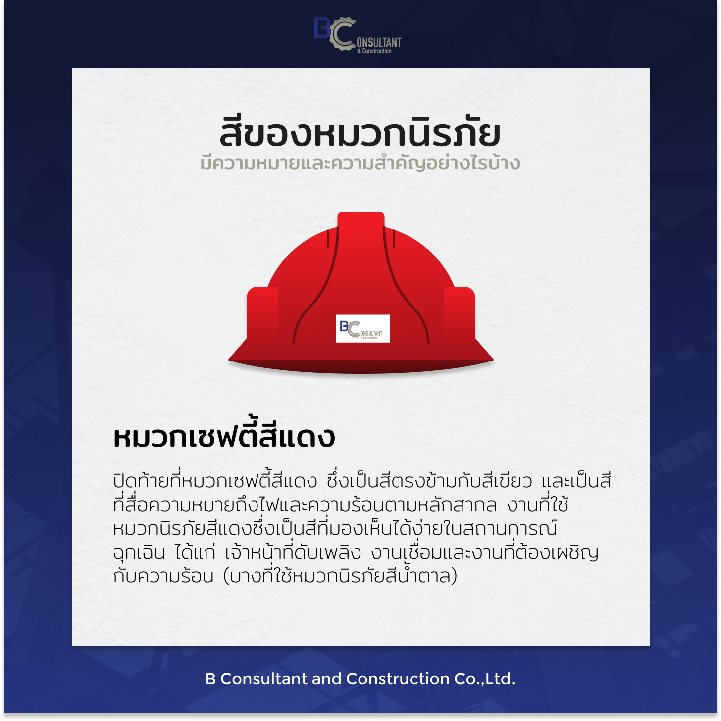 ปิดท้ายที่หมวกเซฟตี้สีแดง ซึ่งเป็นสีตรงข้ามกับสีเขียว และเป็นสีที่สื่อความหมายถึงไฟและความร้อนตามหลักสากล งานที่ใช้หมวกนิรภัยสีแดง ซึ่งเป็นสีที่มองเห็นได้ง่ายในสถานการณ์ฉุกเฉิน ได้แก่ เจ้าหน้าที่ดับเพลิง งานเชื่อม และงานที่ต้องเผชิญกับความร้อน (บางที่ใช้หมวกนิรภัยสีน้ำตาล)